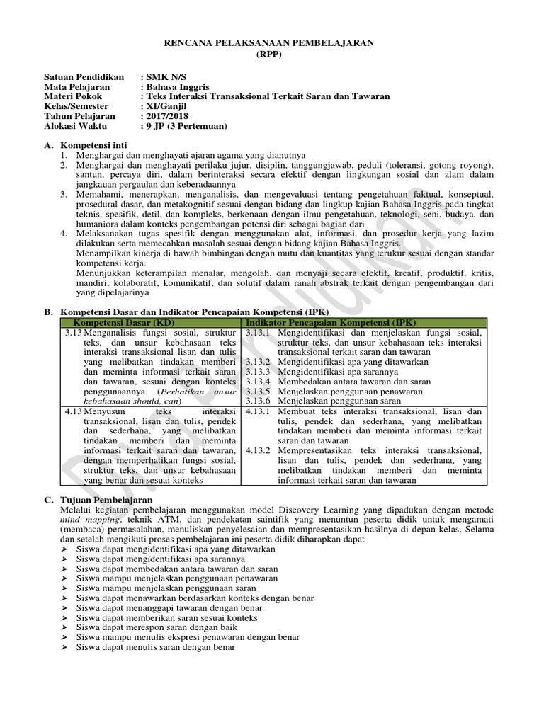 Analisis keterkaitan ki dan kd dengan indeks pencapaian kompetensi dan materi pembelajaran; Silabus bahasa inggris kelas 12 k13 revisi 2018.doc, unduh Beli rpp bahasa inggris kelas 10 kurikulum 2013 online terdekat di dki jakarta berkualitas dengan harga murah terbaru 2021 di tokopedia! Silahkan kunjungi blog tekno guru www.ahzaa.net.full description . Alokasi waktu, sesuai dengan jumlah jam pelajaran dalam struktur kurikulum untuk satu semester atau satu tahun.